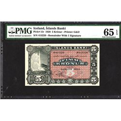 Iceland. 5 Kronur. P-15r. Geyser at left. One signature, remainder. G&D. Graded Gem Uncirculated 65 EPQ.