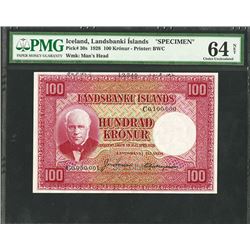 Iceland. 1928, 100 Kronur, P-30s, Specimen, Red on m/c, PMG graded Choice Uncirculated 64 NET with note of previously mounted and printers annotations