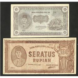 Indonesia. 40, 100 Rupiah. P-29, VF-XF and P-33, XF-AU. Sukarno at left on both. 2 pieces.