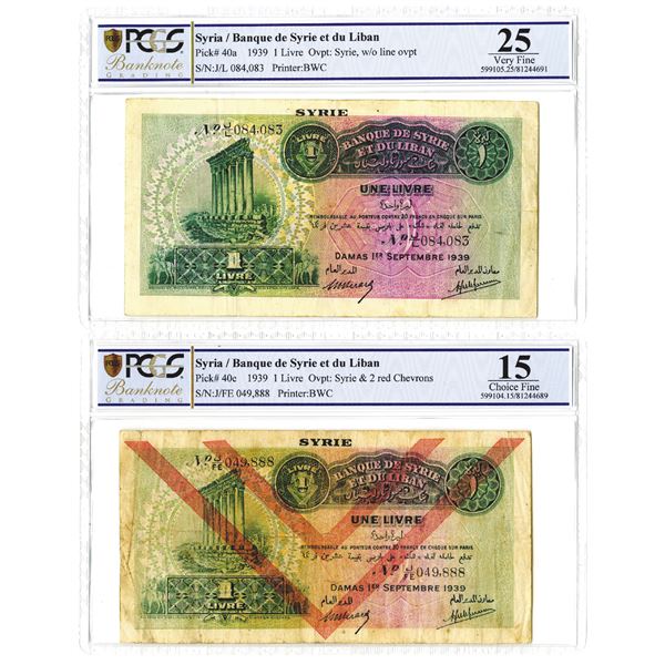 Syria, 1939, Lot of 2 notes, Includes 1 Livre, P-40a, Overprint: Syrie w/o line ovpt., PCGS graded Very Fine 25; and, 1 Livre, P-40e, Overprint: Syrie