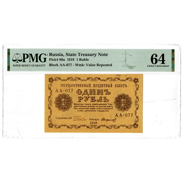 Russia. 1918. 1 Ruble, P-86a, Issued banknote, Brown on tan underprint, Block AA-077, Watermark: Value Repeated, PMG graded Choice Uncirculated 64 wit