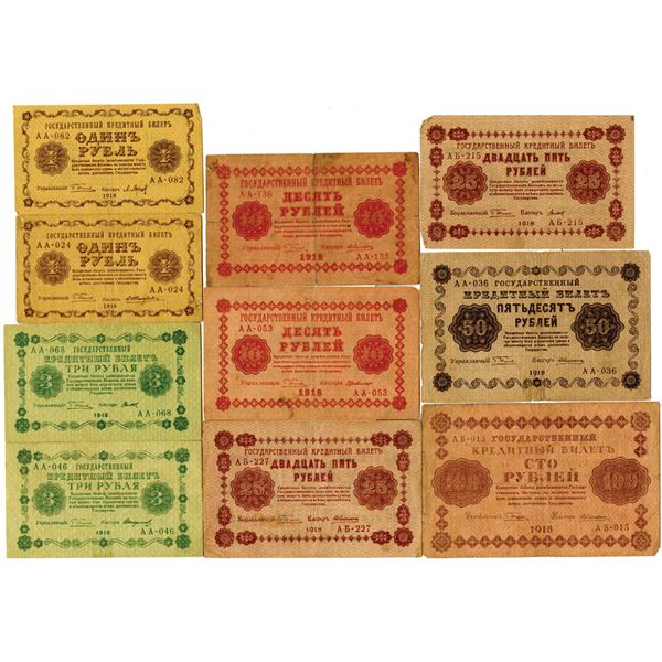 Russia. 1918. Lot of 17 issued banknotes: 1 Ruble P-86 (2); 3 Rubles P-87 (2); 10 Rubles P-89 (2); 25 Rubles P-90 (2); 50 Rubles P-91; 100 Rubles P-92
