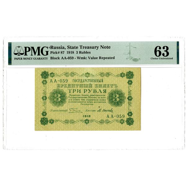 Russia. 1918. 3 Rubles, P-87, Issued banknote, Green on light green underprint, Block AA-059, Watermark: Value Repeated, PMG graded Choice Uncirculate
