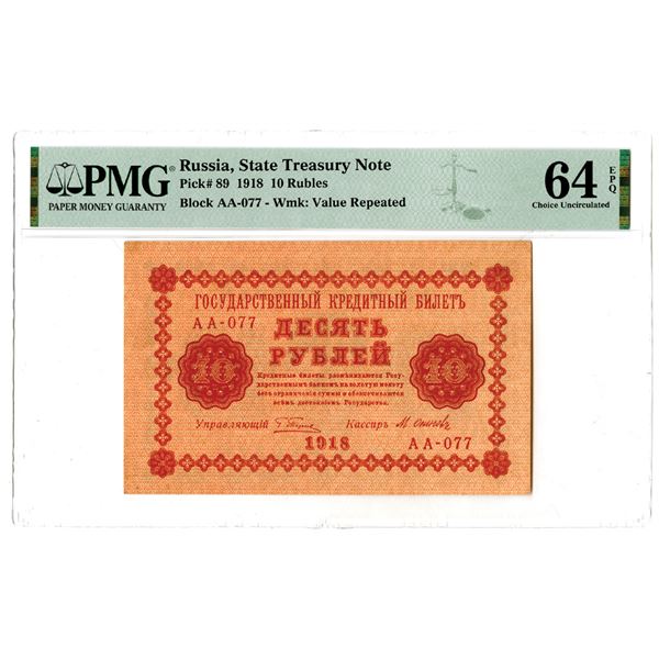 Russia, 1918. 10 Rubles, P-89, Issued Banknote. Red brown on orange. Block AA-077. Watermark is the value repeated. PMG graded Choice Uncirculated 64