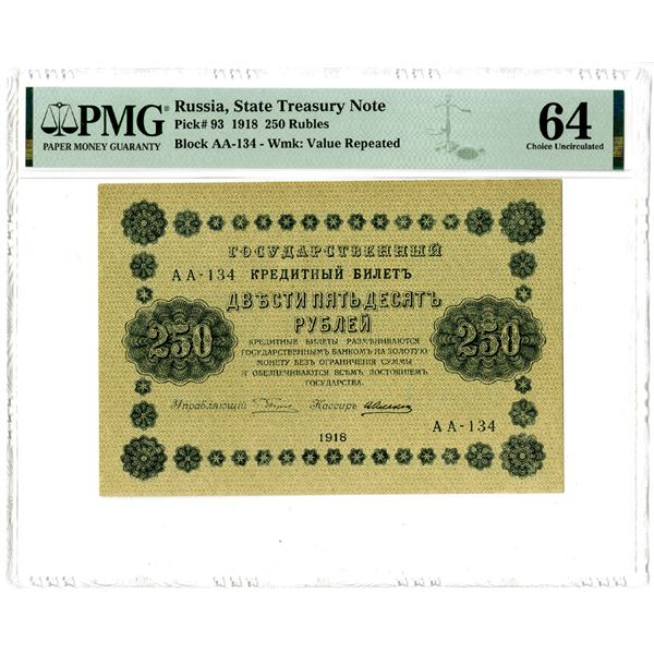 Russia, 1918. 250 Rubles, P-93, Issued Banknote. Dark green on light green. Block AA-134. Watermark is the value repeated. PMG graded Choice Uncircula