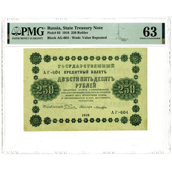 Russia, 1918. 250 Rubles, P-93, Issued Banknote. Dark green on light green. Block AG-604. Watermark is the value repeated. PMG graded Choice Uncircula