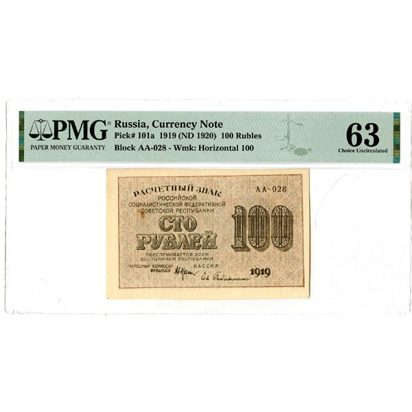 Russia, 1919 (ND 1920). 100 Rubles, P-101a, Issued Banknote. Dark brown or black on light brown underprint. Block # AA-028 with watermark of horizonta