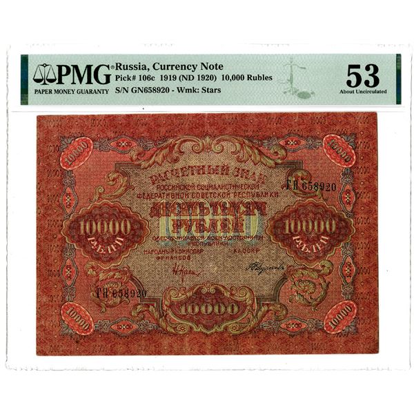Russia. 1919 (ND 1920). 10,000 Rubles, P-106c, Issued banknote, Red on purple and multicolor underprint, S/N GN658920, Watermark: Stars, PMG graded Ab