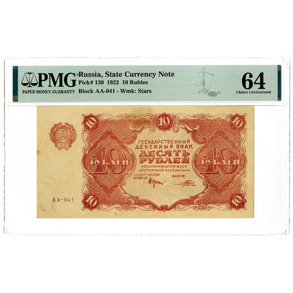 Russia. 1922. 10 Rubles, P-130, Issued banknote, Red, Block AA-041, Watermark: Stars, PMG graded Choice Uncirculated 64.