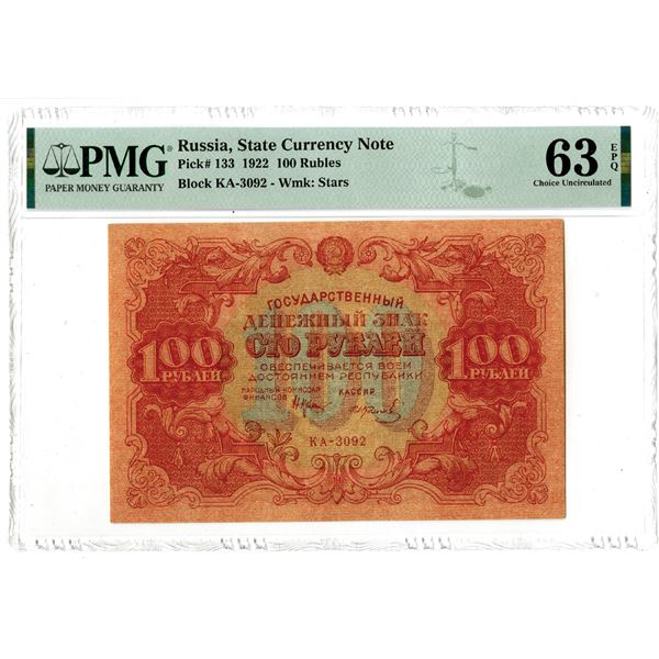 Russia, 1922. 100 Rubles, P-133, Issued Banknote. Red with blue and tan underprint. Block KA-3092 with watermark of stars. PMG graded Choice Uncircula