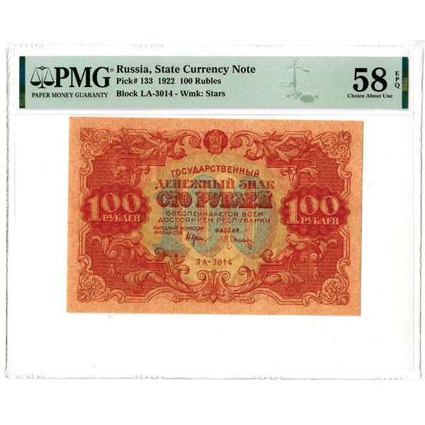 Russia, 1922. 100 Rubles, P-133, Issued Banknote. Red with blue and tan underprint. Block LA-3014 with watermark of stars. PMG graded Choice About Unc