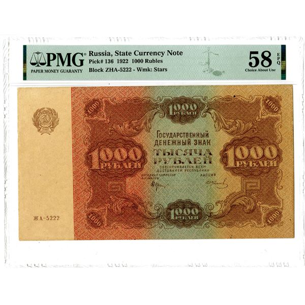 Russia, 1922. 1000 Rubles, P-136, Issued Banknote. Brown, blue, and red print. Block ZHA-5222. Watermark of stars. PMG graded Choice About Uncirculate