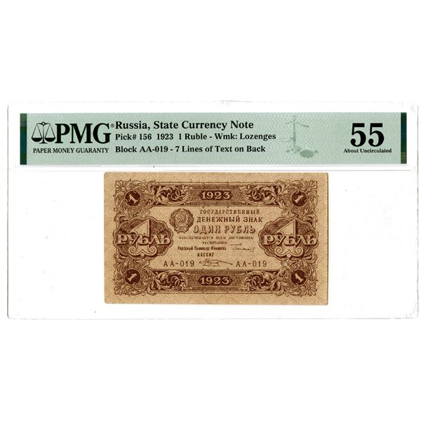 Russia. 1923. 1 Ruble, P-156, Issued banknote, Dark brown on light brown underprint, Block AA-019, 7 Lines of Text on Back, Watermark: Lozenges, PMG g
