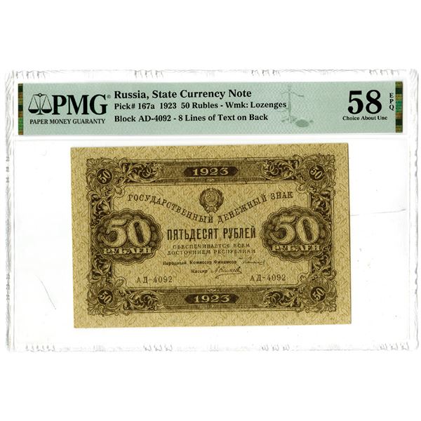 Russia, 1923. 50 Rubles, P-167a, Issued Banknote. Brown on brown paper with watermark of Lozenges. Block AD-4092. PMG graded Choice About Uncirculated