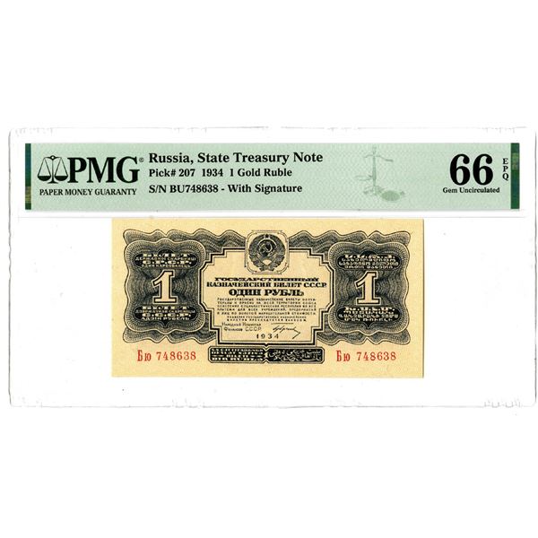 Russia. 1934. 1 Gold Ruble, P-207, Issued banknote, Dark blue face, S/N BU748638 - With Signature, PMG graded Gem Uncirculated 66 EPQ.