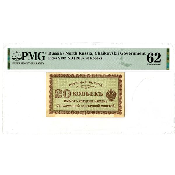 Russia/North Russia, ND (1919). 20 Kopeks, P-S132, Issued Banknote. Brown on green underprint. PMG graded Uncirculated 62 with notation "corner...