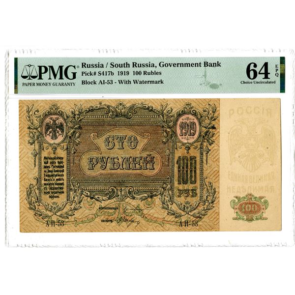 Russia, South Russia, 1919. 100 Rubles, P-S417b, Issued Banknote. Black on brown and m/c underprint. Block AI-53. PMG graded Choice Uncirculated 63. O