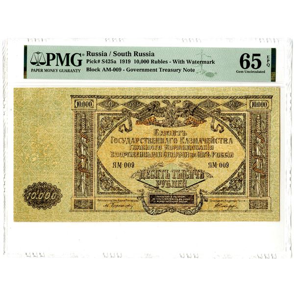 Russia, South Russia, 1919. 10,000 Rubles, P-S425a, Issued Banknote. Black on brown, green, tan, and m/c underprint. Block AM-009. PMG graded Gem Unci