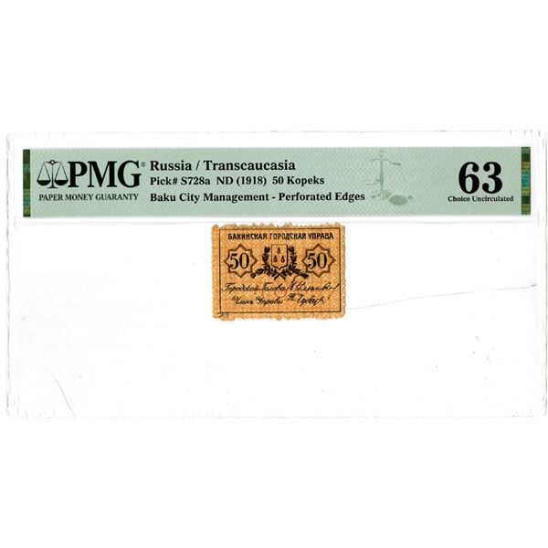 Russia/Transcaucasia, ND (1918). 50 Kopeks, P-S728a, Issued Banknote. Black on reddish brown underprint with arms at center and perforated edges, 1.75