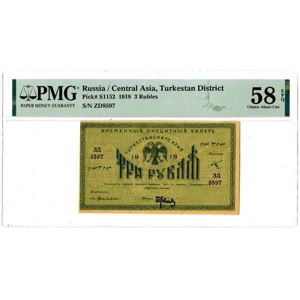 Russia/Central Asia, 1918. 3 Rubles, P-S1152, Issued Banknote. Dark green on green underprint. S/N ZD8597. PMG graded Choice About Uncirculated 58 EPQ