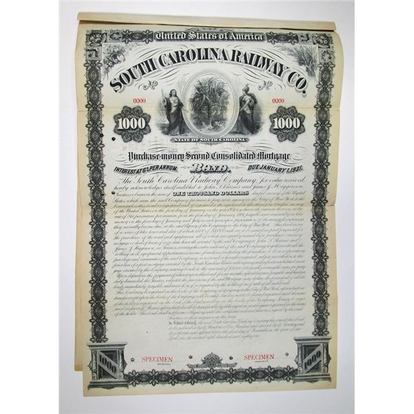 South Carolina, 1881. $1000 Specimen 6% Purchase Money Second Consolidated Mortgage Coupon Bond, Black on black border with Allegorical figures at top