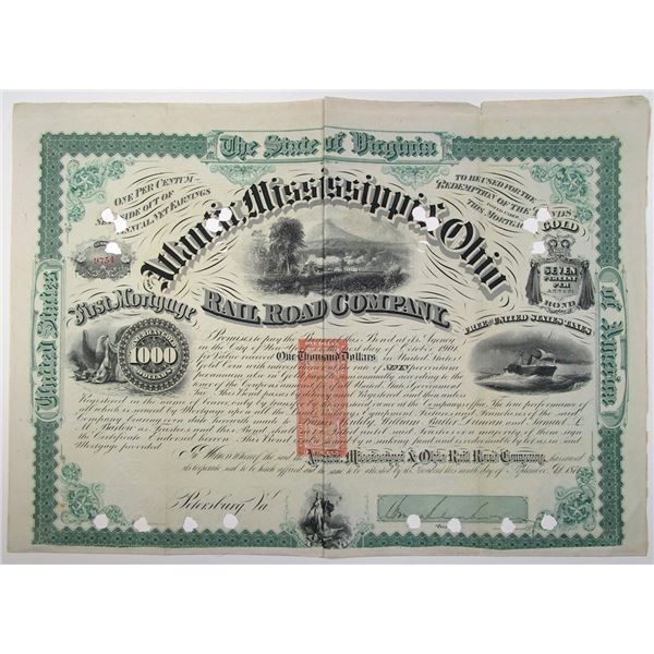 Atlantic, Mississippi & Ohio Rail Road Co. 1871 Bond Signed by William Mahone with Imprinted USIR Re662 - Atlantic, Mississippi & Ohio Rail Road Co. 1871 Bond Signed by William Mahone with Imprinted USIR Re