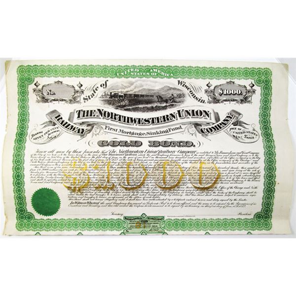 Northwestern Union Railway Co. 1872 Listed Railroad but no Examples known, $1000 Specimen Gold Bond 664 - Northwestern Union Railway Co. 1872 Listed Railroad but no Examples known, $1000 Specimen Gold Bond