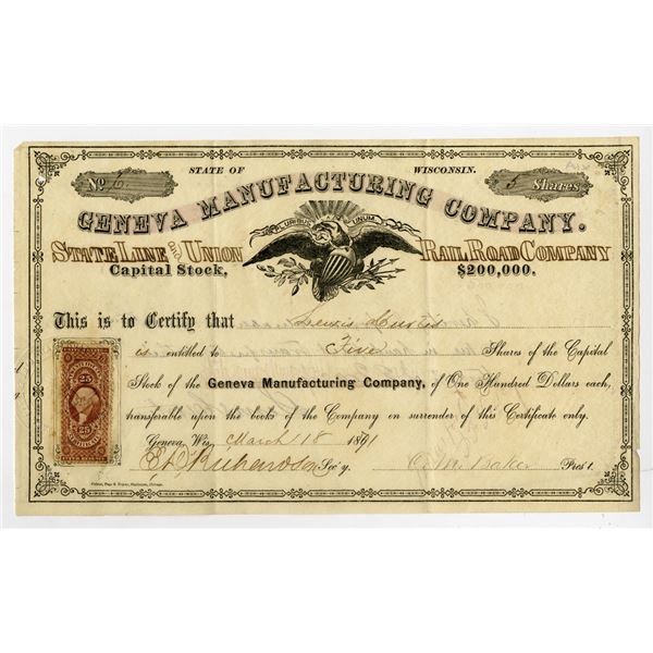 State Line and Union Rail Road Co., Written on a Geneva Manufacturing Company Stock Certificate, 187665 - State Line and Union Rail Road Co., Written on a Geneva Manufacturing Company Stock Certificate, 187