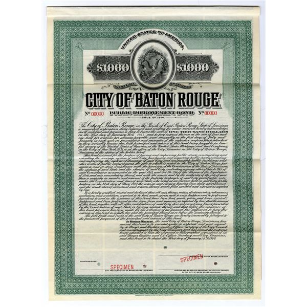 Baton Rouge, Louisiana. 1914, $1000 Specimen 4 1/2% Public Improvement Coupon Bond, Black print on green border and under tint, Seal of Louisiana at t