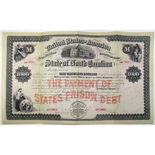 Raleigh, North Carolina, 1899. $1000 Specimen 4% State Prison Debt Bond, Black text with black border and red underprint, North Carolina State Capitol