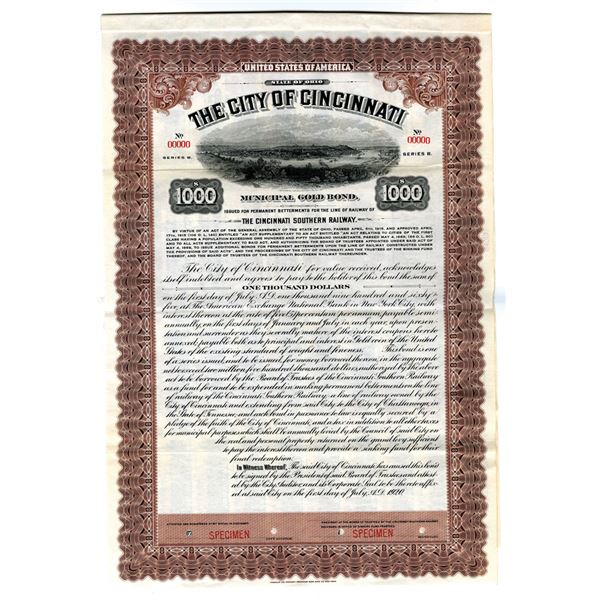 Cincinnati, Ohio, 1920. $1000 Specimen 5% Municipal Gold Coupon Bond, Black on brown border, Scenic view of river at top, Specimen overprints and POCs