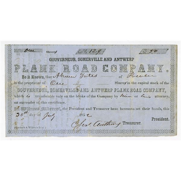 Gouverneur, Somerville and Antwerp Plank Road Co., 1852 I/U Stock Certificate677 - Gouverneur, Somerville and Antwerp Plank Road Co., 1852 I/U Stock Certificate