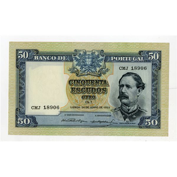 Portugal....., 1955. 50 Escudos, P-160, Issued Banknote, Blue on m/c underprint with arms at top center and portrait of Fontes Pereira de Melo at righ