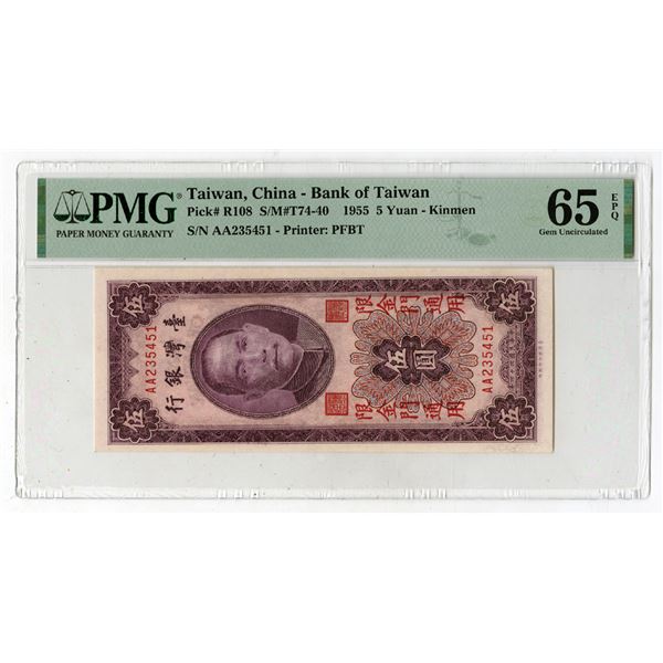 Taiwan, China, 1955. 5 Yuan, P-R108 S/M#T74-40, Kinman Branch, Issued Banknote, Note in vertical format, Purple on pink and m/c underprint with SYS at
