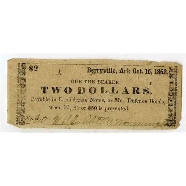 Berryville, Arkansas. October 16, 1862. $2, Unlisted in Rothert and Criswell, Issued obsolete scrip note, Dated October 16th, 1862, "Payable in...