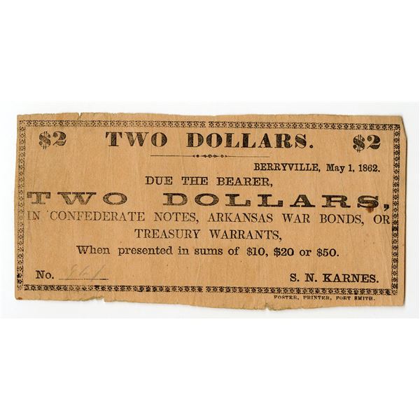 2 - Berryville, Arkansas. S.N. Karnes, 1862, $2 Obsolete Scrip Note Rarity.Archives International Auctions