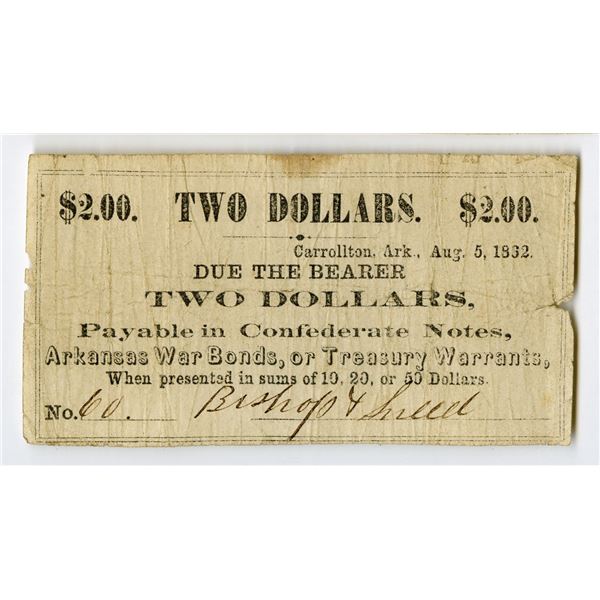 3 - Carrollton, Arkansas. Bishop & Snell. 1862, $2, Obsolete Scrip NoteArchives International Auctions