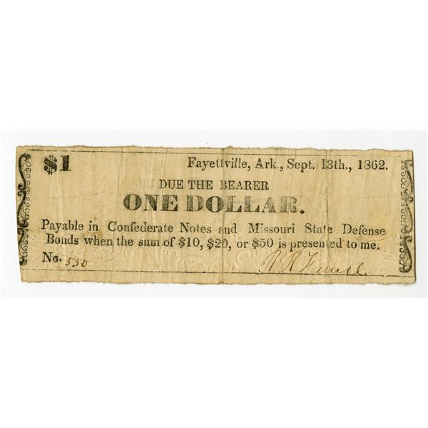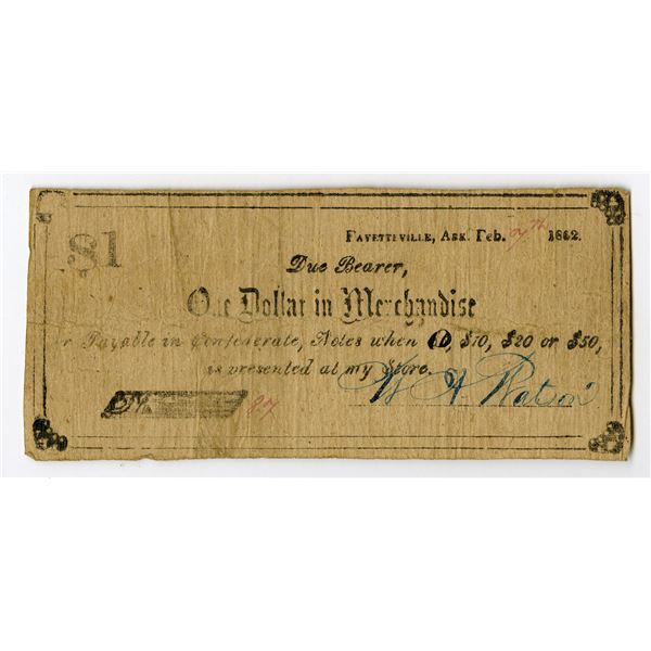 7 - Fayetteville, Washington County, Arkansas. W.A. Watson, 1862, $1, Obsolete Scrip NoteArchives International Auctions