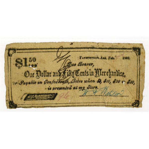 8 - Fayetteville, Washington County, Arkansas. W.A. Watson, 1862, $1.50, Obsolete Scrip NoteArchives International Auctions