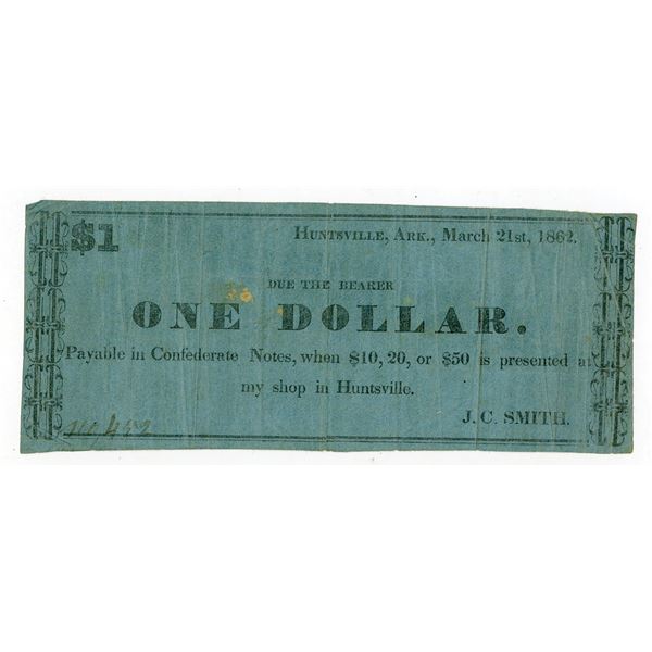 9 - Huntsville, Arkansas. J.C. Smith, 1862, $1, Obsolete Scrip NoteArchives International Auctions