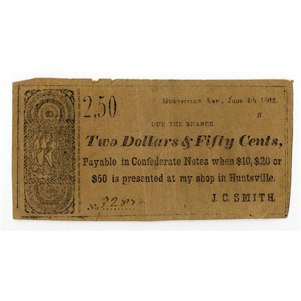 10 - Huntsville, Arkansas. J.C. Smith, 1862, $2.50, Obsolete Scrip NoteArchives International Auctions