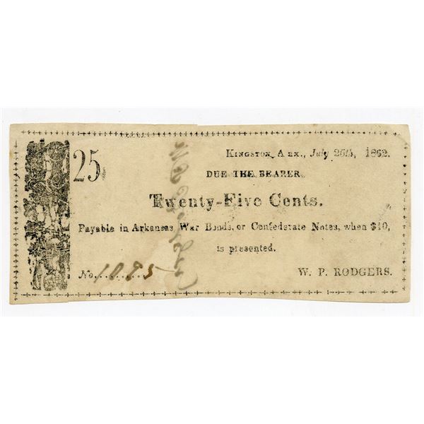 12 - Kingston, Arkansas. W.P. Rodgers, 1862, 25 Cents, Obsolete Scrip NoteArchives International Auctions