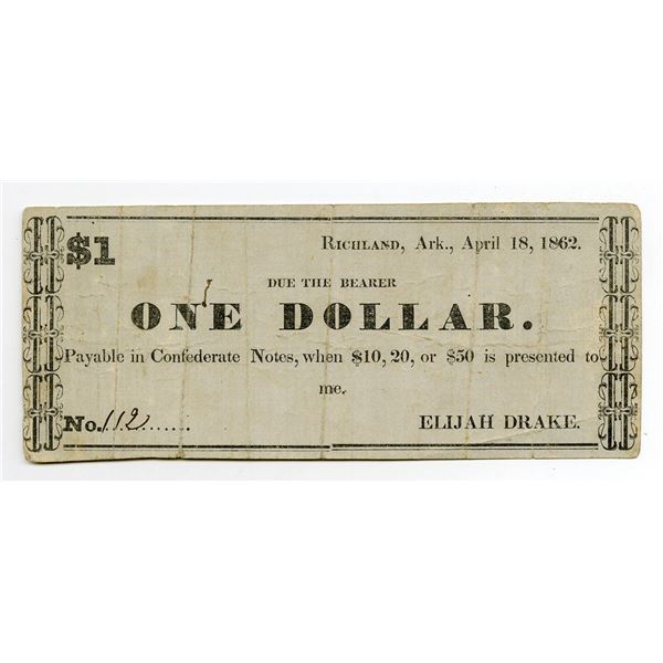 13 - Richland, Madison County, Arkansas. Elijah Drake, 1862, $1, Obsolete Scrip NoteArchives International Auctions