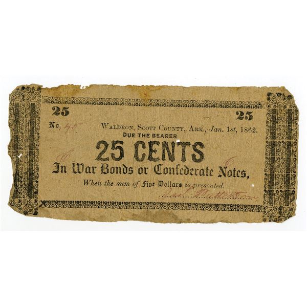 15 - Waldron, Arkansas. James Patterson, 1862, 25 Cents, Obsolete Scrip NoteArchives International Auctions