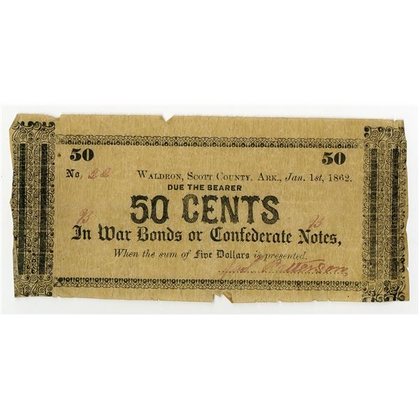 16 - Waldron, Arkansas. James Patterson, 1862, 50 Cents, Obsolete Scrip NoteArchives International Auctions