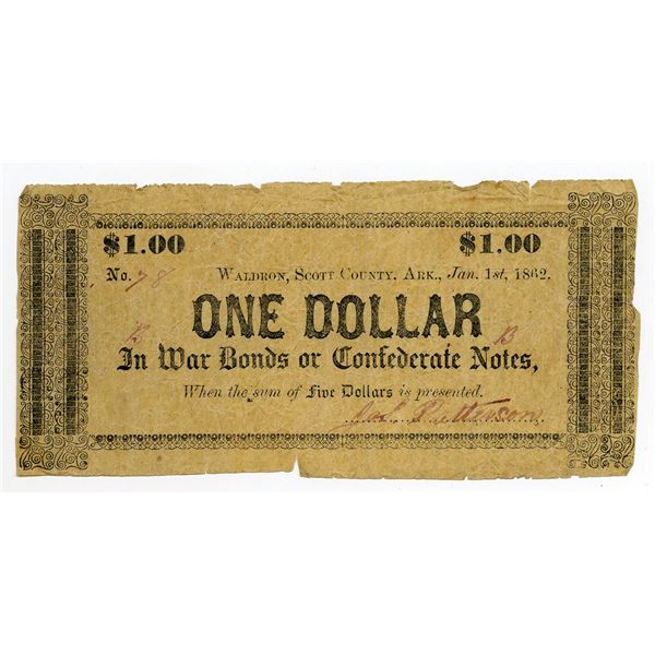 Waldron, Scott County, Arkansas. January 1, 1862, James Patterson. $1, (Rothert 671-2), Issued obsolete scrip note, Dated January 1st, 1862, Black te