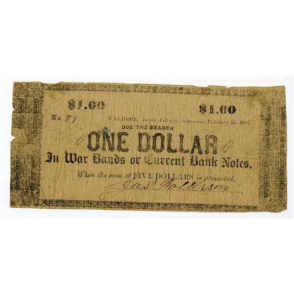 Waldron, Scott County, Arkansas. February 25, 1862, James Patterson. $1 Unlisted variety, (Rothert-671-2 Unlisted Variety), Issued obsolete scrip note