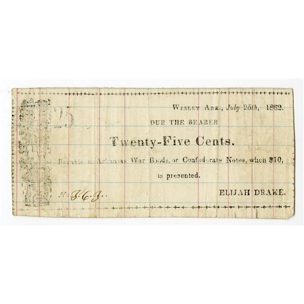 19 - Wesley, Arkansas. Elijah Drake, 1862, 25 Cents, Obsolete Scrip NoteArchives International Auctions