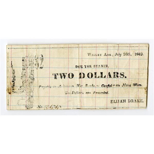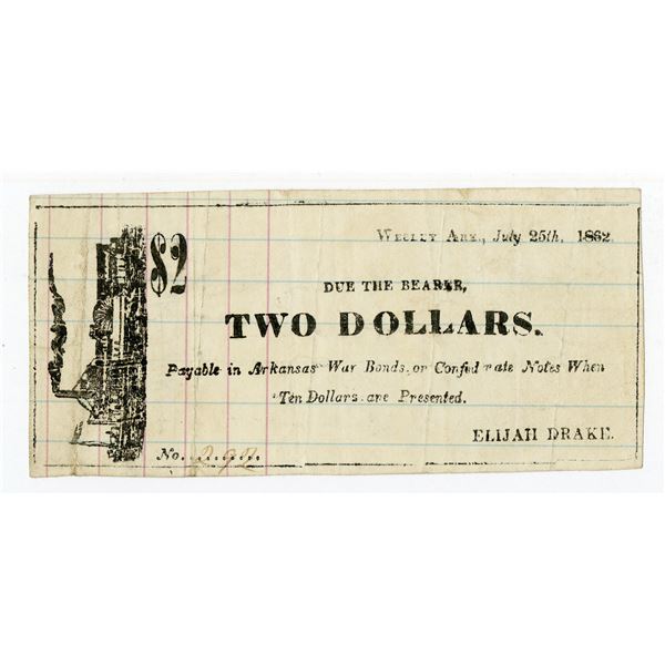 22 - Wesley, Arkansas. Elijah Drake, 1862, $2, Obsolete Scrip NoteArchives International Auctions