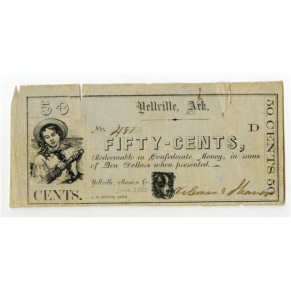 23 - Yellville, Arkansas. Coleman & Shaver, 1862, 50 Cents, Obsolete Scrip NoteArchives International Auctions